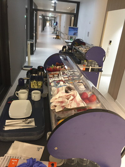 Patienten die aufstehen konnten gingen in den Flur und stellten sich ihr Frühstück selber zusammen.