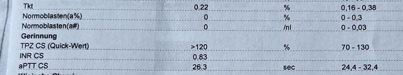Hier meine Werte: INR CS: 0.83 / TPZ CS(Quick-Wert): 120% / aPPT CS: 26.3 sec
