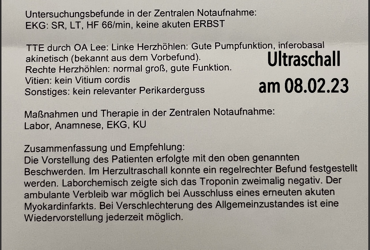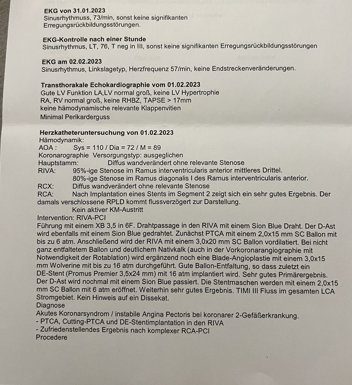 So Anfang Januar 2023 hatte ich immer wenn ich mich etwas belastet hatte so ein komisches brennen im Brustbereich was sich in beide Lungenseiten gezogen hat. Hab mir natürlich nix dabei gedacht weil ich vor ca. 4-5 Wochen eine etwas stärkere Erkältung hatte. Dachte ok vielleicht bin ich noch nicht zu 100% fit. Das Brennen kam und ging und wurde teilweise sogar schlimmer. Und da sagte meine Frau „so ab ins KH“. Was ich auch tat. War am gleichen Tag in der Notfallambulanz und haben mich direkt untersucht. EKG, 2x Troponinwerte und großes Blutbild. War alles top und wurde verständlicherweise nach Hause entlassen. Am nächsten Tag, ging es mir gut auch wenn ich mich belastet hatte. Dachte mir hm komisch gestern noch in der Notfallambulanz und keine 24std als ob ich nix hätte. Darauf der Tag fing schon echt beschissen an Bluthochdruck 163/101 Puls 157 und das in Ruhe (keine typischen Angina Pectoris Symptome). Ich bekam Angst, war innerlich total unruhig und meine Frau rief sofort einen Notarzt an. Vor Ort EKG gemacht und mir Blutverdünner gespritzt und ab ins Krankenhaus. Selbst da waren alle Werte ok. EKG, Blutwerte usw.