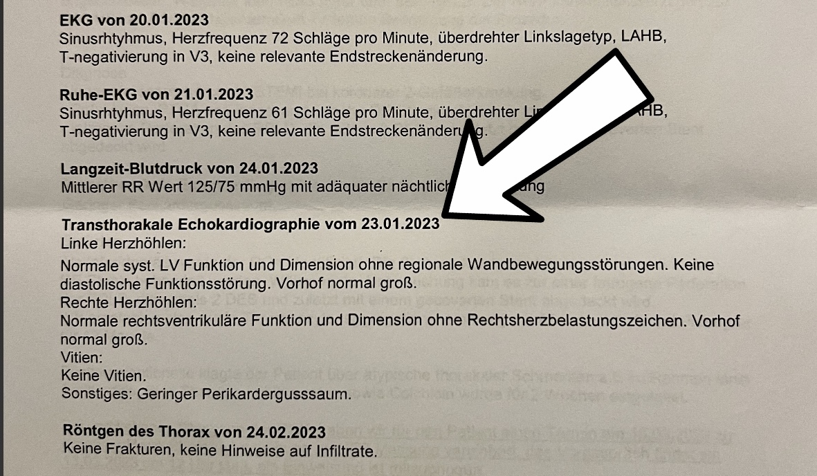 Habe auch die Befunde als Anhang rein gepackt. Kann mir einer von euch bitte sagen was bei der Ultraschalluntersuchung von 8.2.23 „inferobasal akinetisch (bekannt aus dem Vorbefund).“ beudeutet? In Klammern steht bekannt aus dem Vorbefund aber in keinem Vorbefund steht was. Alle Ultraschalls waren doch ok. Oder wie versteht ihr das?