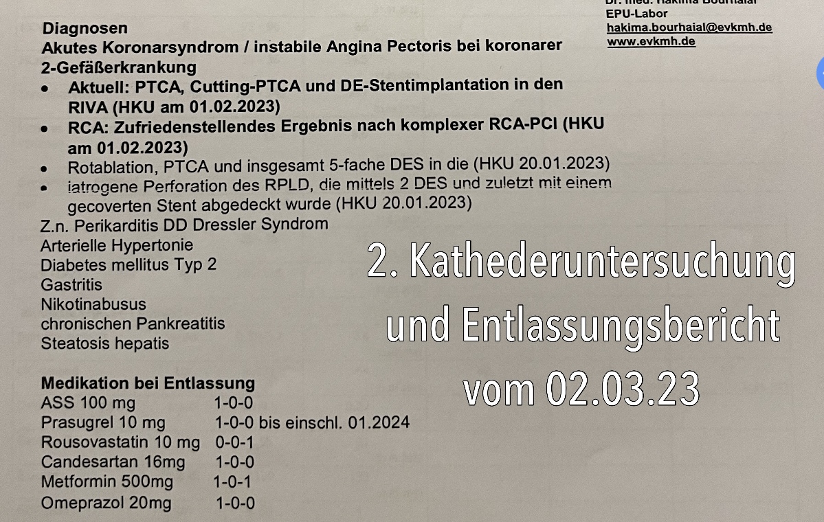 Kurze Vorgeschichte: Mein KardioDoc bei meiner Kontrolluntersuchung, hatte mir im Jahr 2022 vorgeschlagen das er mit mir eine Myokardzintegrafie machen wollte um Nummer sicher zu gehen weil ich Risiko Patient war mit bekanntem Bluthochdruck, Diabetes Typ 2 und Raucher. Gesagt getan. Das Ergebnis war eigentlich soweit ok. Mein Doc hielt es aber dennoch für Sinnvoll eine Kathederuntersuchung zu machen. Und genau das wollte ich nicht weil ich mir dachte warum ich habe null Beschwerden und hatte ehrlich gesagt auch echt Angst davor (hätte ich mal damals doch gemacht).
