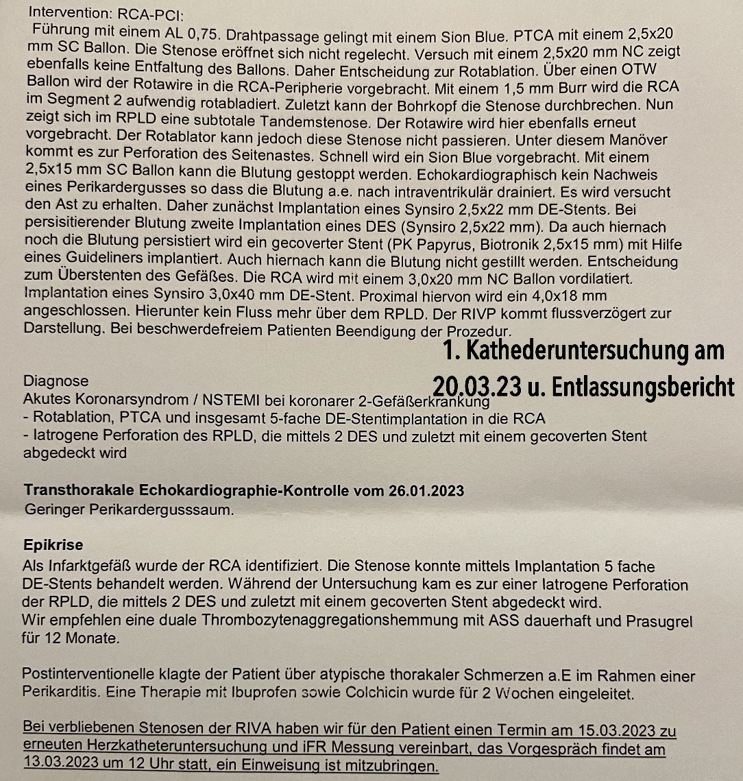 Am gleichen Tag kam der KardioDoc (Oberarzt) zu mir ins Zimmer und hat mir wegen meiner Risikogeschichte und Rücksprache mit mein Kardiologen geraten dringend eine Kathederuntersuchung zu machen. Ich willigte diesmal ein und keine Stunde später lag ich auf dem Tisch. Es wurden insgesamt 6-7 stents gesetzt. Bei der Untersuchung kam es wohl zum verletzen eines Gefäßes was der doc mit 3 stents repariert hat. Hatte wohl bei der Untersuchung einen (Gottseidank) kl. Herzinfarkt bekommen aber ohne Vernarbung etc.